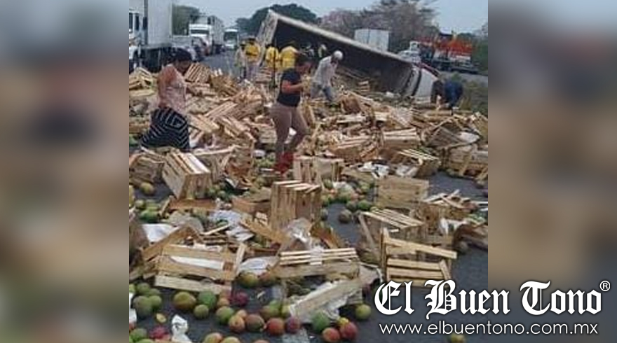 Cosamaloapan, Ver.- Un cargamento de mango petacon fue robado, luego de que el camión en el que era transportado, se volcara esta tarde a la altura del kilómetro 24 de la autopista Cosamaloapan-Isla.
