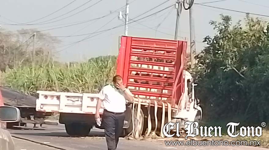 Amatlán.- Un tractocamión tipo plataforma de una empresa avícola, volcó en la carretera estatal Córdoba-Atoyac, a la altura del Parque Industrial de Paraje Nuevo.