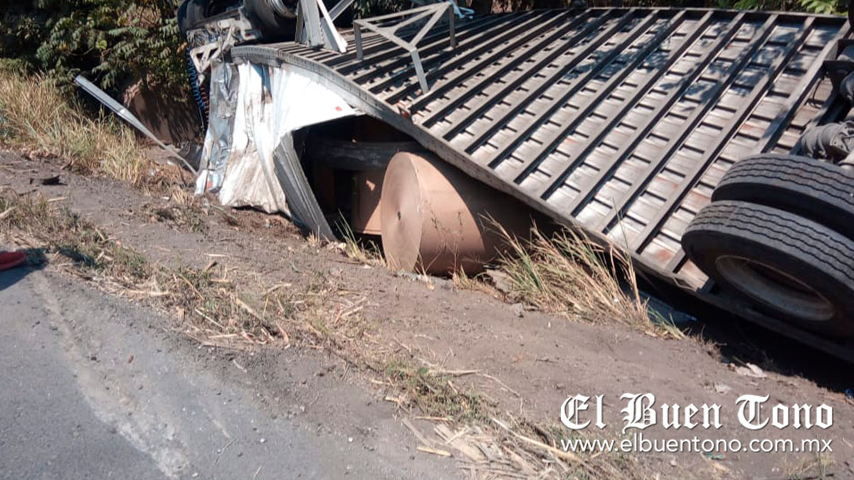 CUITLÁHUAC.- Daños materiales, movilización de grupos de auxilio y elementos de la Policía Municipal, dejó la volcadura del segundo remolque de un tractocamión con bobinas de papel cuando se le desprendió por el kilómetro 22+500 de la carretera federal Córdoba-La Tinaja, a la altura de la comunidad de San Ángel.