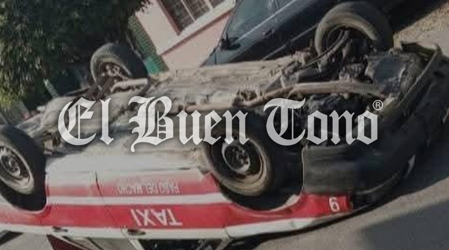 Paso del Macho, Ver.- El taxi número 9 terminó volcado luego de chocar contra un automóvil Nissan Sentra, esta mañana de miércoles a la altura de la calle Lagunilla.