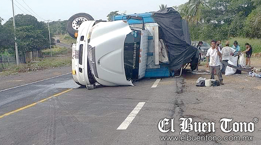 Cotaxtla.- El exceso de velocidad y la falta de precaución para manejar provocaron que un camión tipo torton cargado con alimento, se volcara durante la mañana de ayer domingo en la carretera federal Córdoba-Veracruz, a la altura de la comunidad El Pedregal.