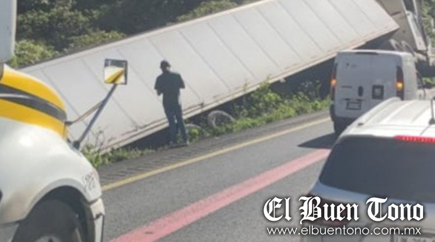Maltrata.- Prácticamente volcado terminó un tráiler, que se quedó sin frenos cuando circulaba sobre el tramo carretero de las Cumbres de Maltrata, de la Puebla-Córdoba, aunque afortunadamente el operador logró salir ileso. El accidente ocurrió a las 10:00 horas, cuando un vehículo marca Kenworth Kenmex de color blanco, con placas de circulación del SPF, se desplazaba sobre el carril de descenso, enganchado a un remolque tipo caja seca.