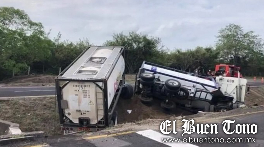 El chofer del tráiler salchicha de doble remolque perdió el control y la unidad volcó en la cuneta que divide los carriles a 300 metros antes de la caseta de Paso del Toro.