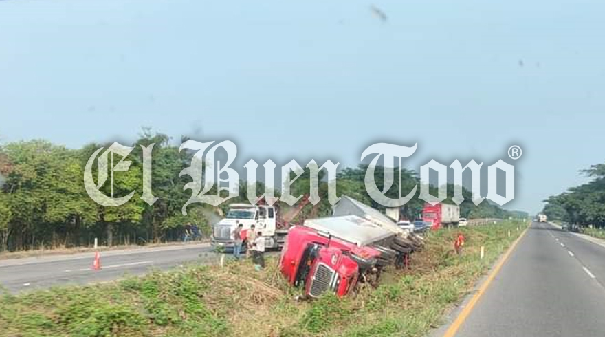 Cotaxtla, Ver.- Un tractocamión con caja seca se volcó durante la madrugada de este domingo en la autopista Córdoba-Veracruz, a la altura del kilómetro 51.