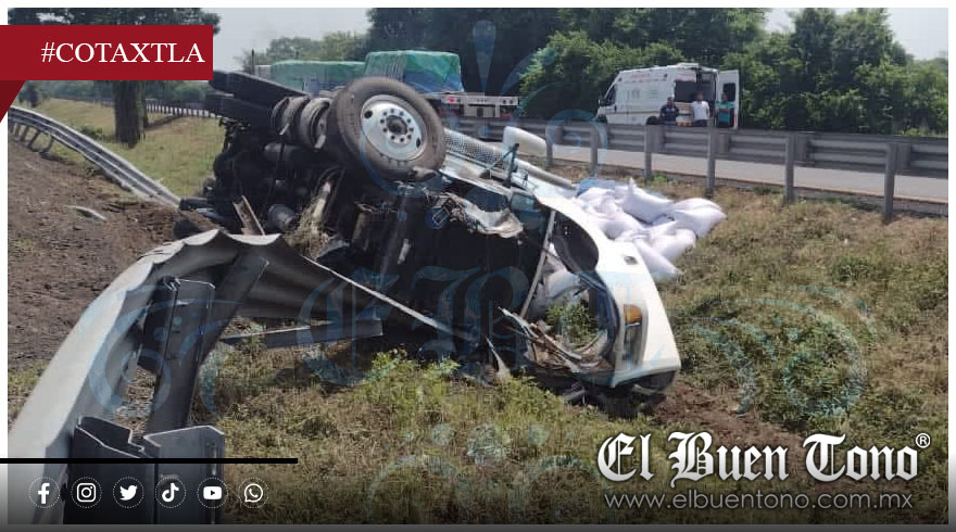 Cotaxtla, Ver.- Un tractocamion con caja seca, cargada con café, se volcó durante la tarde de este viernes en la autopista Córdoba-Veracruz, a la altura del kilómetro 83.