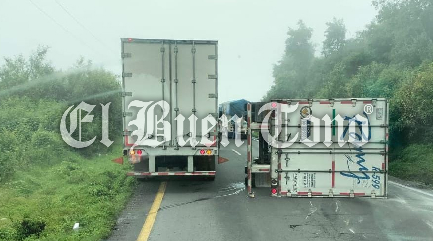 Las condiciones climáticas adversas de piso mojado y la velocidad inmoderada, provocó que la pesada unidad volcara sobre su lado derecho, no se reportaron personas lesionadas, pero sí daños materiales.