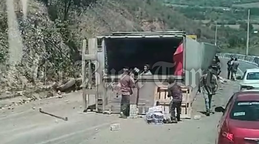 Maltrata, Ver.- Un trailer que terminó volcado en la autopista fue robado por los ladrones que operan impunemente en las Cumbres de Maltrata bajo la complacencia de las autoridades de la Guardia Nacional.