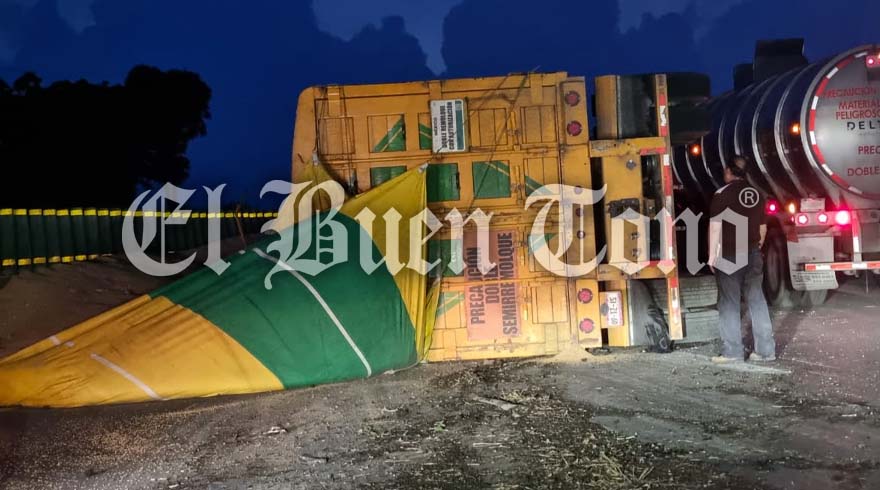 Amatlán. – La noche de este sábado, un camión volcó en la autopista Córdoba-Veracruz, específicamente en el libramiento que conecta con la carretera federal en Rancho Trejo.