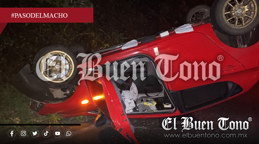 Paso del Macho, Ver.- Un vehículo particular de color rojo se volcó la madrugada de este miércoles sobre la carretera estatal Atoyac–Paso del Macho, a la altura del cerro del Chiquihuite, dejando como saldo únicamente daños materiales.