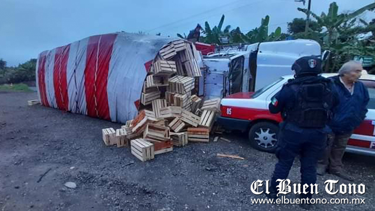 Fortín.- Un camión tipo Torton, cargado con cajas de madera, terminó volcado además de colisionar contra el taxi número 85 de Fortín, luego de que su conductor perdiera el control al momento de circular sobre la carretera federal Fortín- Huatusco.