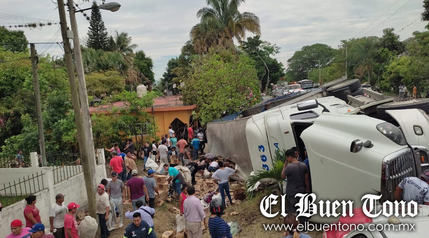 Amatlán.- Un tractocamión doble remolque que transportaba cervezas terminó volcado la tarde de este martes, luego de que su operador perdiera el control al volantear para no impactarse contra otro vehículo en la carretera federal Córdoba-Veracruz, a la altura de la comunidad Venta Parada, llegando decenas de personas para robarse el cargamento antes del arribo de la Policía Municipal y Guardia Nacional.
