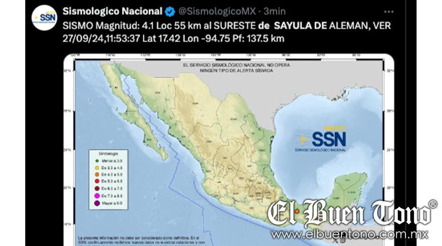 Veracruz.- 😨 El Servicio Sismológico Nacional (SSN) reportó un sismo de magnitud 4.1 que sacudió la región a las 11:53 a.m. del 27 de septiembre de 2024 (tiempo del Centro de México).