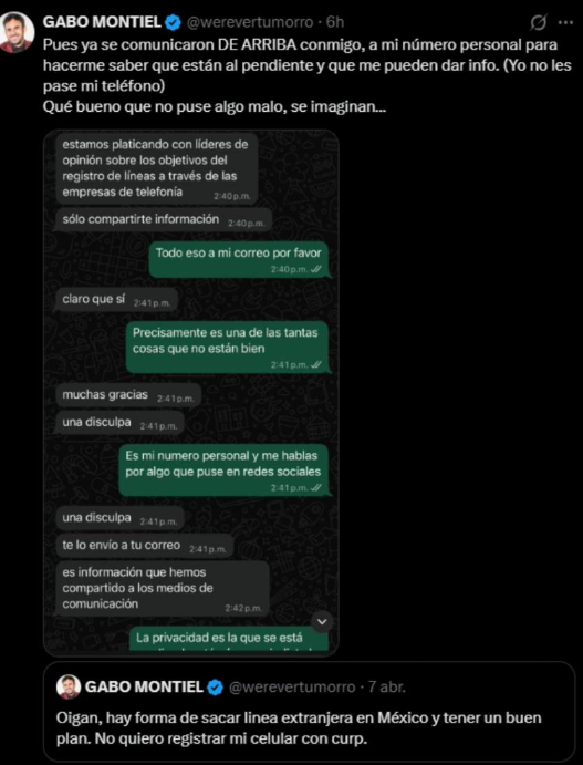 A través de sus redes, Montiel explicó que buscaba alternativas para obtener una línea telefónica extranjera en México y evitar el registro obligatorio, argumentando que el sistema podría poner en riesgo sus datos personales. Tras su publicación, Ricardo Salinas Pliego, dueño de Grupo Salinas, respondió que era posible contratar una eSIM virtual desde el extranjero y advirtió sobre los riesgos de que los datos biométricos se filtren al crimen organizado.