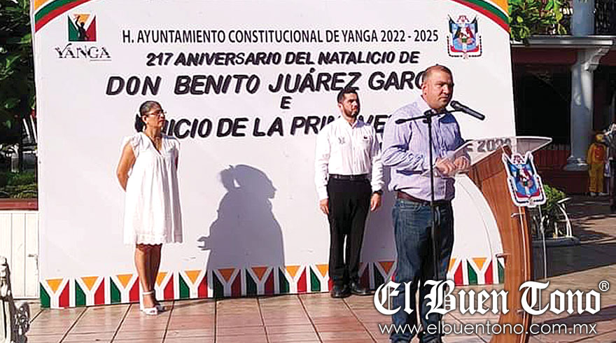Yanga.- Para conmemorar el 217 Aniversario del natalicio de Benito Juárez, “El Benemérito de las Américas”, autoridades municipales, que preside Fernando Nicolás Gordillo Torres, llevaron a cabo un acto cívico en la explanada del parque central.