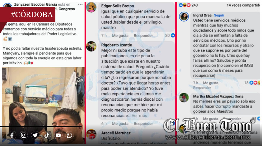 Córdoba, Ver.- Mientras miles de maestros reciben atención precaria en diferentes hospitales del estado, el diputado federal Zenyazen Escobar presume atención de primera en el Congreso de la Unión por una supuesta lesión en la mano. La publicación generó críticas por la evidente desigualdad, contrastando los privilegios del legislador con la falta de especialistas, largos tiempos de espera y carencias que enfrentan los derechohabientes de los diversos centros médicos.